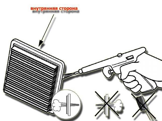 В зависимости от материала воздушного фильтра, процедура его очистки может быть разной. Если фильтр бумажный, то очищать его следует только сухим способом, т.е. воздухом, если же фильтр из поролона, то его можно очистить влажным способом.